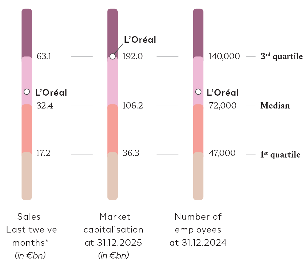 Following this adjustment, L'Oréal is well positioned in the benchmark panel for the key indicators. Based on data available at end-September 2025, the Group is positioned (i) between the median and the third quartile for sales (59%), (ii) in the third quartile for market capitalisation (76%), based on L’Oréal’s capitalisation at 31 December 2025, and (iii) between the median and the third quartile for headcount at 31 December 2024 (58%).